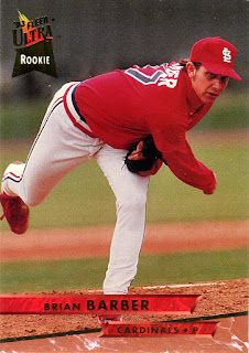 His final 1995 season statistics for the St. Louis Cardinals: 2-1, 5.22 ERA, 29 1/3 innings, 31 hits, 16 walks, 27 strikeouts. Not awful, not great... Barber definitely had youth on his side, and that potential led to even more Brian Barber cards in 1996 sets.