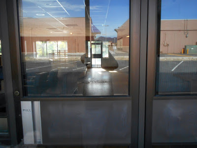 Taken from the west entrance window, with the doors inside. Something looks to have fallen from the ceiling into the lobby floor. This picture predictably didn't turn out with all the conflicting reflections. And there's me in the middle, with a door for my head...