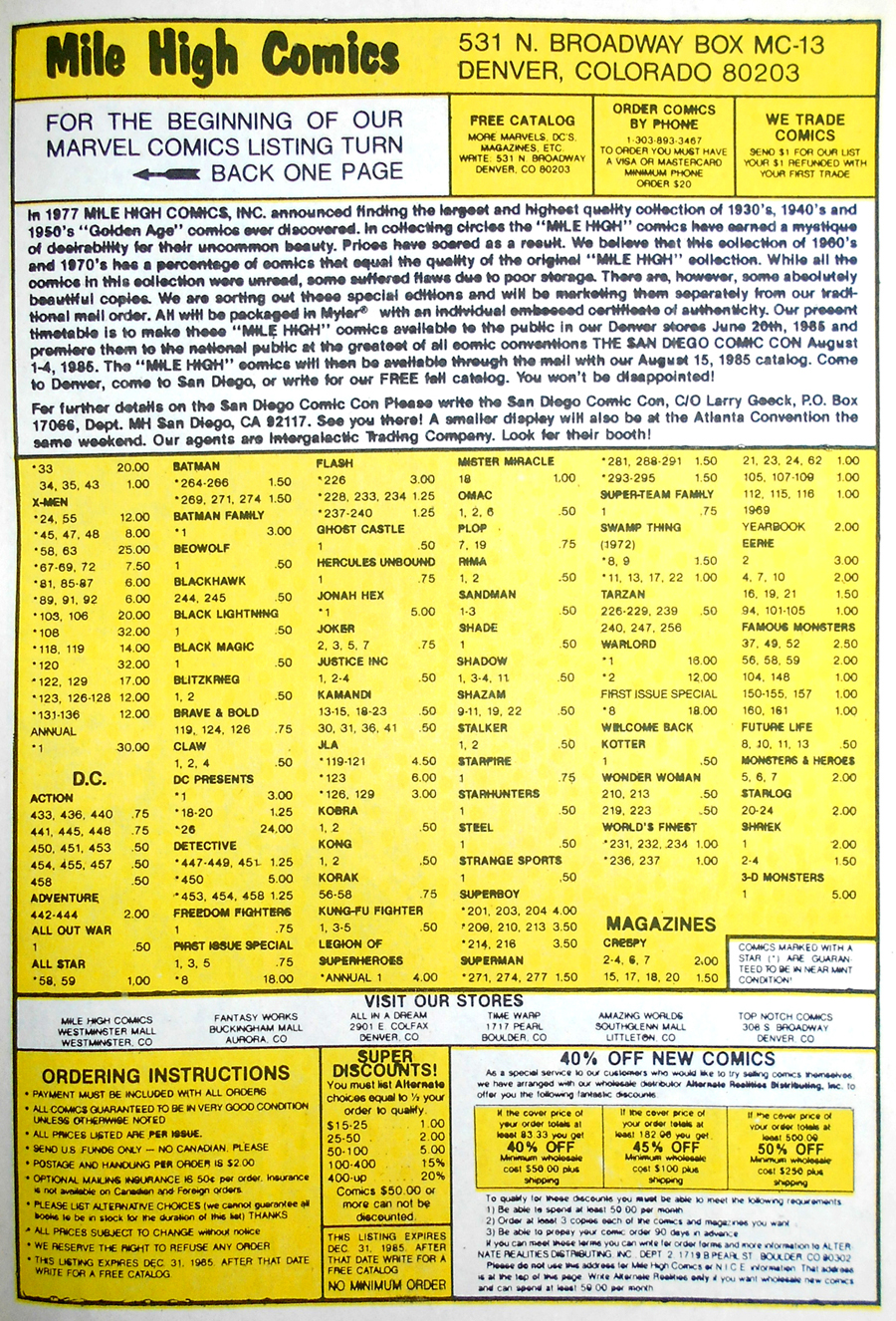 When I was a kid, I knew of Mile High Comics, because of their multi-page advertising in all the editions of Marvel comics. I enjoyed reading their ad every month, as they seemed to advertise the biggest inventory, and were more appealing than the other retail ads that appeared in comic books of the day. I could follow what was hot, by what the Mile High Comics ad was featuring.