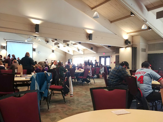 Multiple stations were set up around the auditorium, with photos and artifacts of Brian. Each table had a small flower arrangement with baseball cards sticking out.