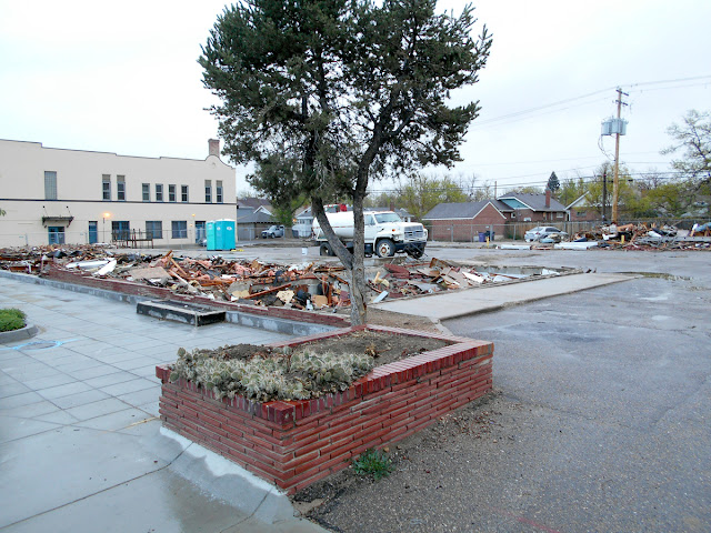 More of the west building's sidewalk and collapsed building debris, and that sad de-slatted fence.